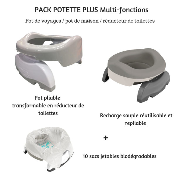 - 1 seul pot pour 3 fonctions : pot de voyages, réducteur de toilettes, pot de maison
